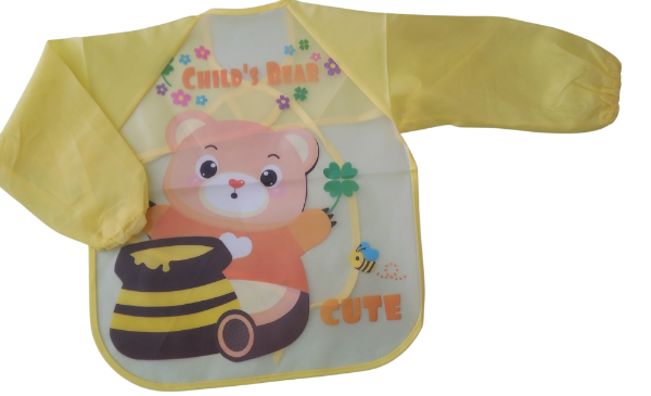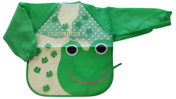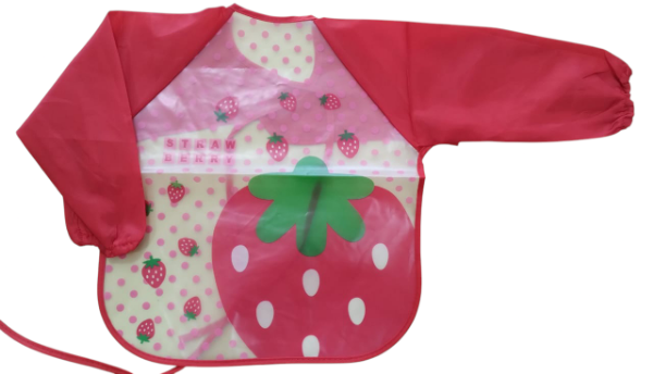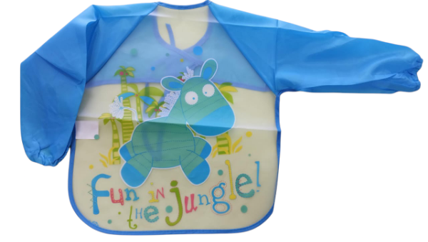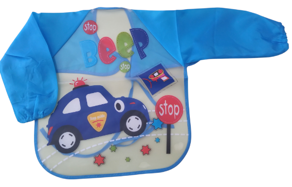 Babero de tela y plástico tipo pintorcito con mangas de tela. Se ata atrás